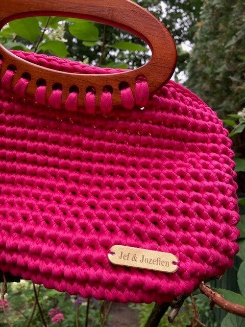 Rose Bohème – Laat je stijl bloeien met deze handgemaakte tas in stralend fuchsia. Het stevige houten handvat en het speelse boho-ontwerp maken haar perfect voor zonnige dagen, zomerse terrassen en feestelijke avonden. Licht, charmant en vol kleur – jouw ultieme eye-catcher.
