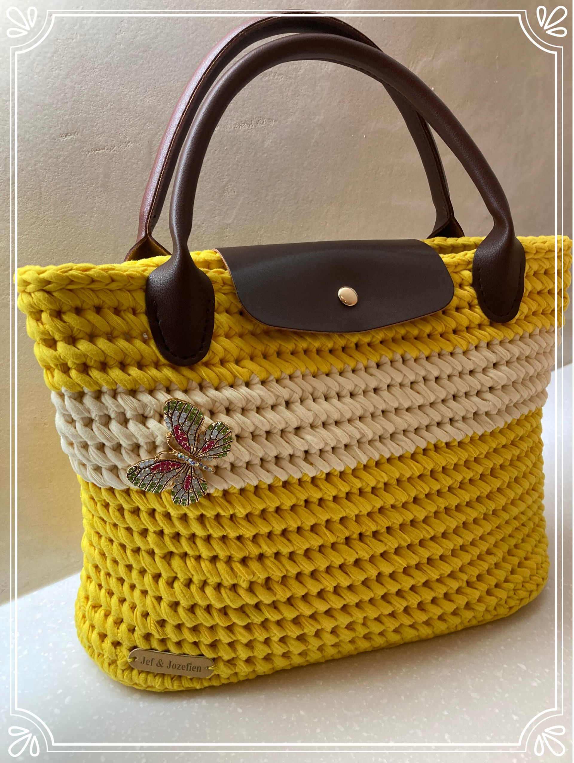 Handgemaakte gehaakte handtas in okergeel, afgewerkt met leren handvatten en een drukknoopsluiting. De tas is gevoerd met een vrolijke vlinderstof en biedt ruimte voor je dagelijkse essentials.Afmetingen: B 32 cm x H 23 cm.