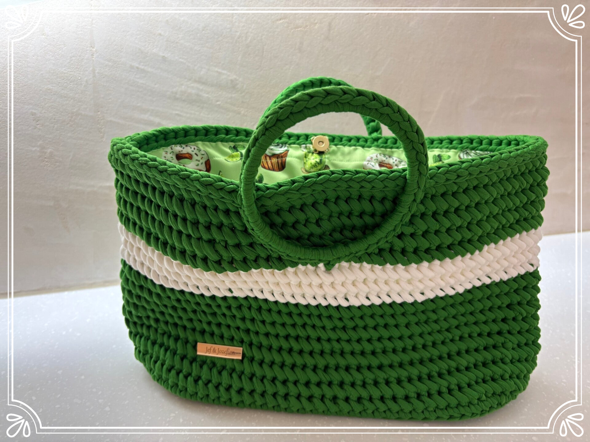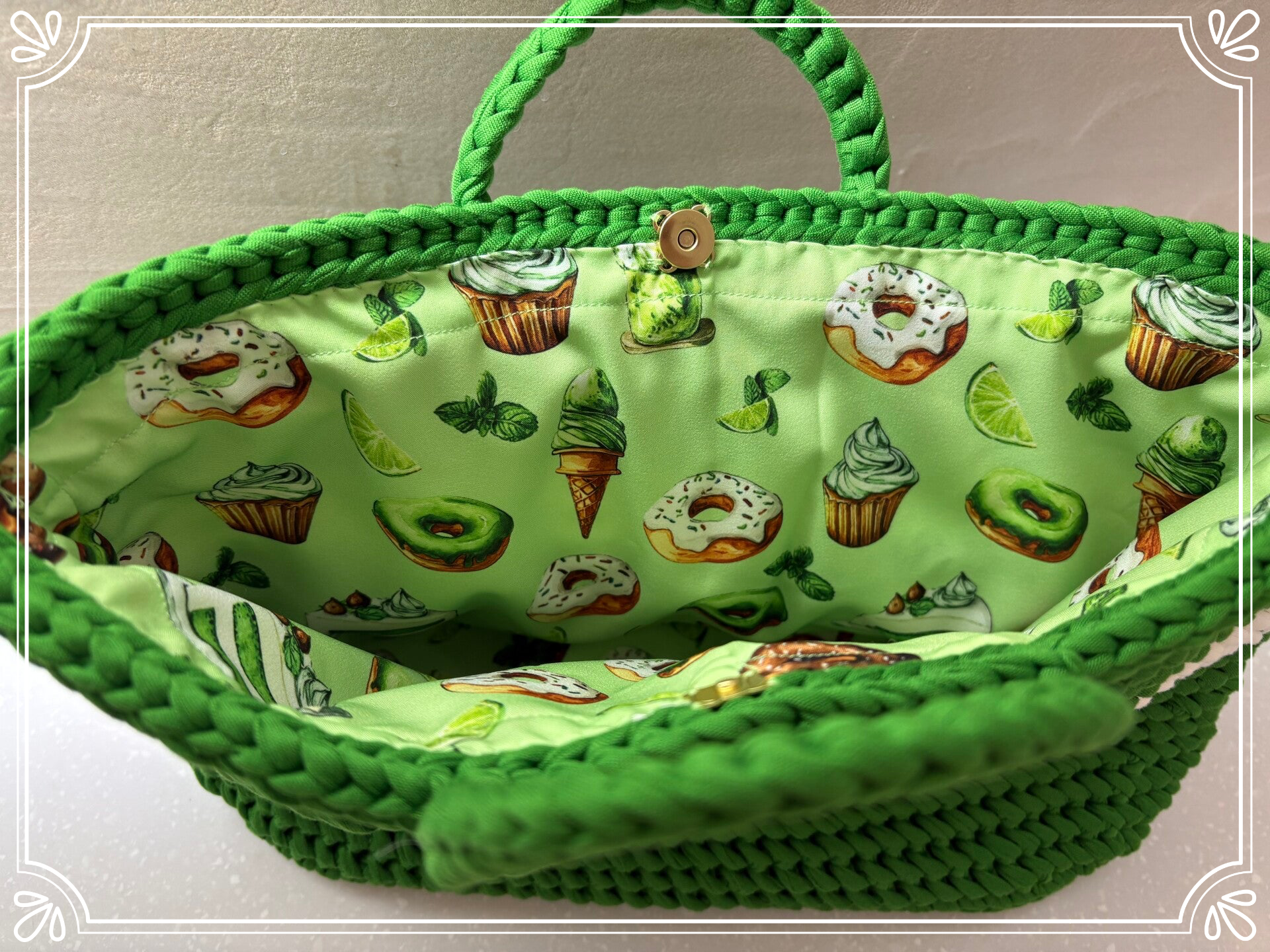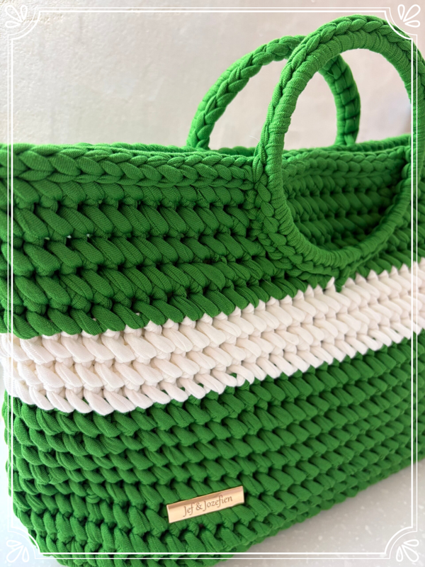 Deze tas roept de frisheid van de zomer uit, met zorg gehaakt in een stralende grasgroene tint en afgewerkt met een speelse voering die voor een verrassend accent zorgt.