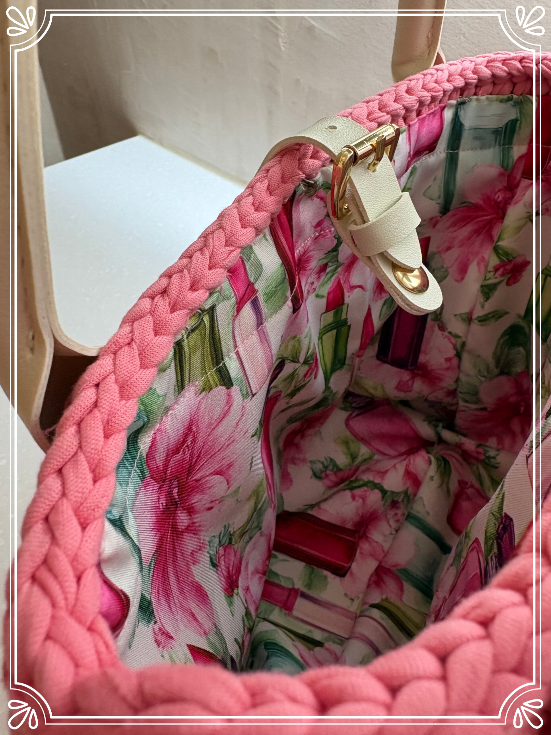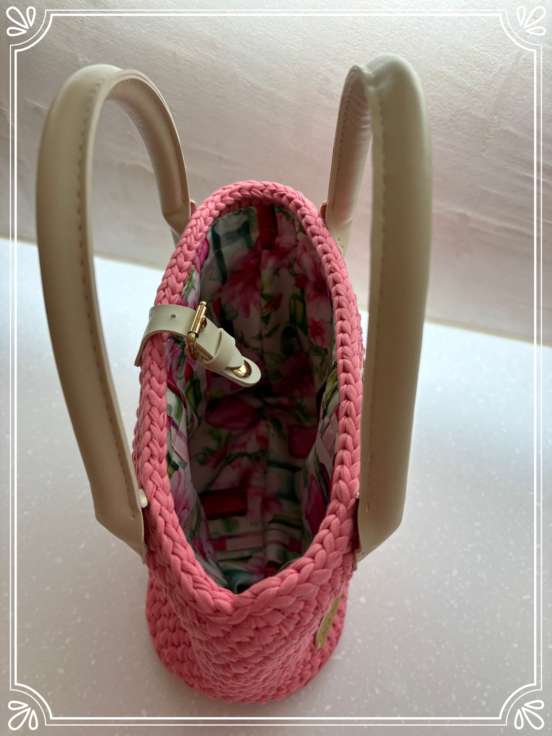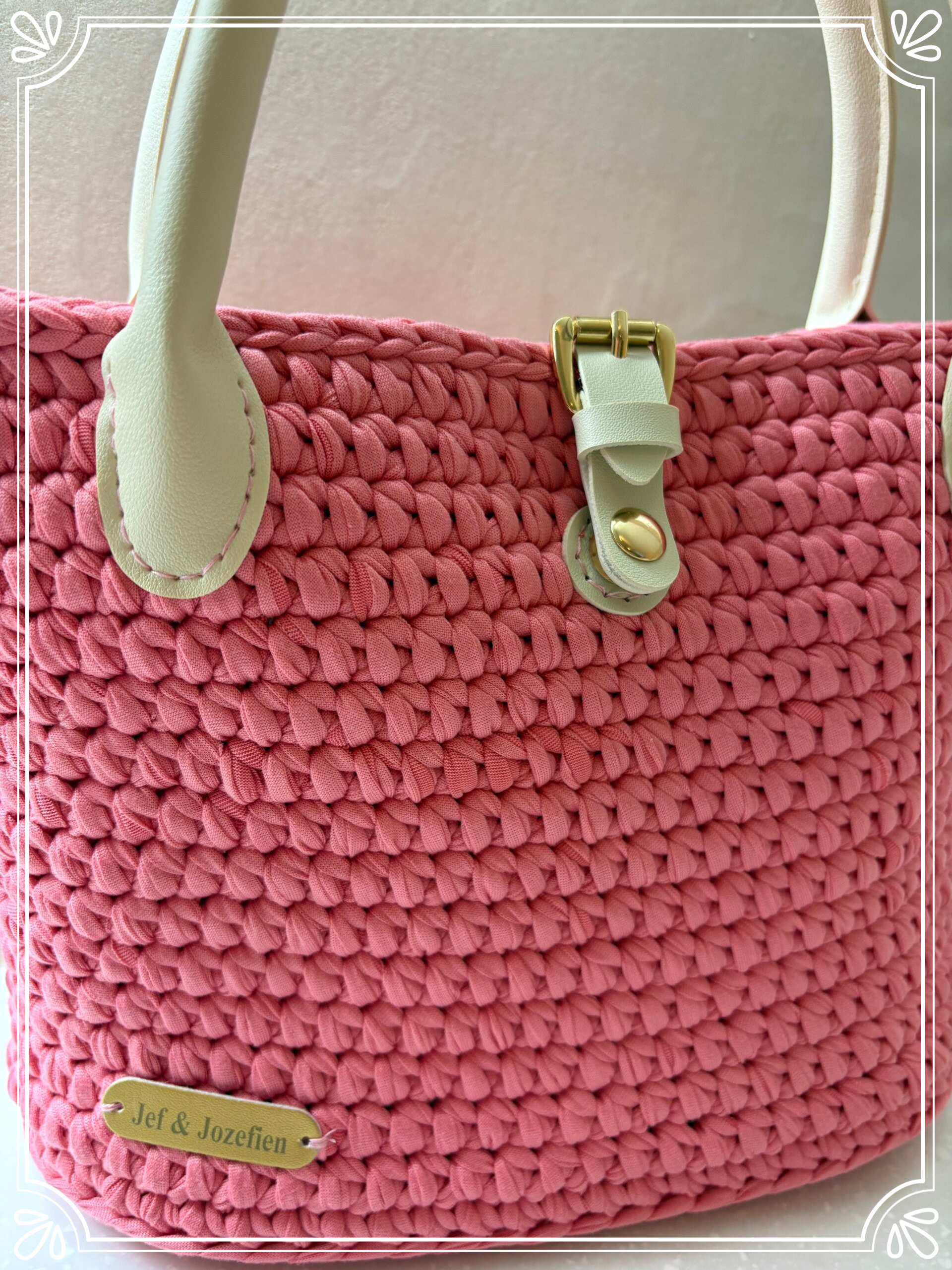 Rosalie is een handgemaakte handtas in een zachte poederroze tint, met verfijnde details en een elegante uitstraling. De tas is zorgvuldig gehaakt en afgewerkt met lichte handvatten en een goudkleurige sluiting.