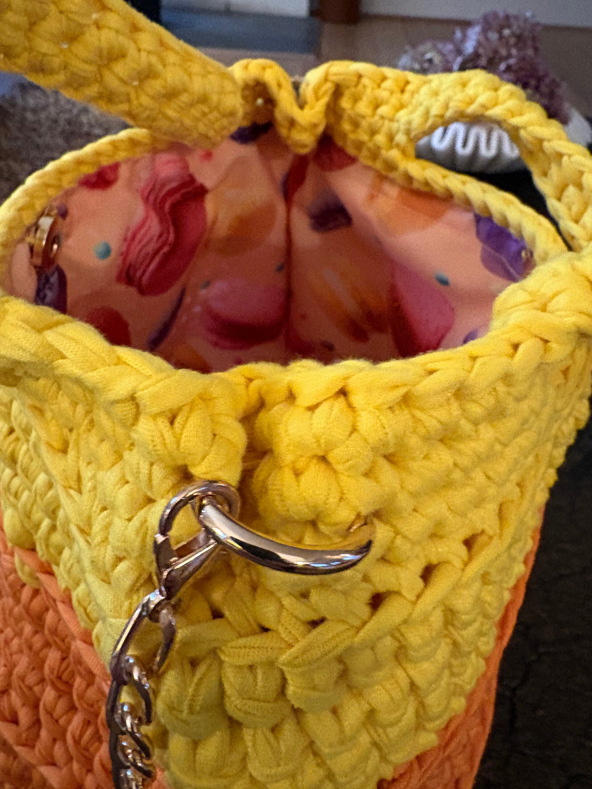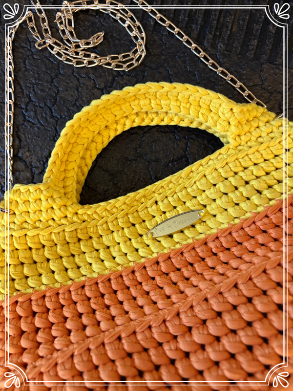 Soleil Mandarine is een handgehaakt tasje in stralend zongeel en warm mandarijnoranje. Compact, speels en chic, met een gouden ketting en vrolijke voering—perfect voor zonnige dagen en zomerse avonden.